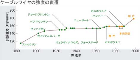鋼絲電纜,直徑φ5.23mm,一條高強度鍍鋅鋼絲電纜由290束所組成,(一束鋼纜為127一條鋼纜290束即為36,830條鋼絲線組成),聯直著四個主要支柱。強度的鋼絲,拉伸強度180Kgf/mm2 (每單位的承載能力為3.9噸)。明石海峽大橋180kgf使用160kgf每平方毫米高強度鋼絲撐載。總長度線中使用的鋼絲線使用總數約30萬公里,可繞七個半地球。鋼絲電纜於架設時考慮了船舶航行渡海時及其他影響力強大的氣流和其他條件,並利用直升機進行吊掛。最大拉伸強度為57萬噸。為了防止生鏽,直徑4毫米,以1.6毫米厚橡膠磁覆蓋並漆上防水漆。
